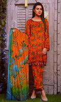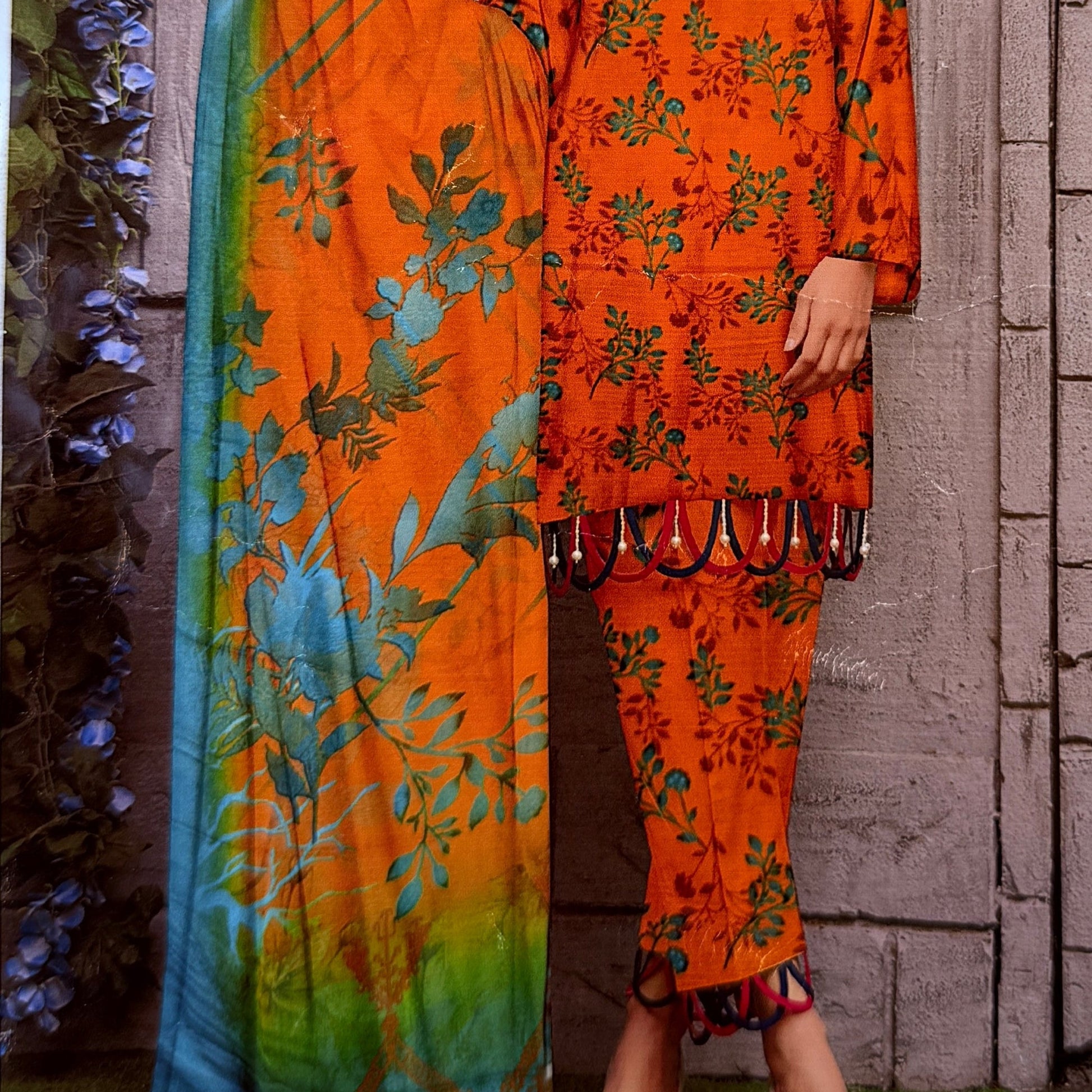 Design: A stunning digital printed bamber chiffon dupatta featuring intricate designs and a lightweight flow, adding a refined finish to the ensemble.