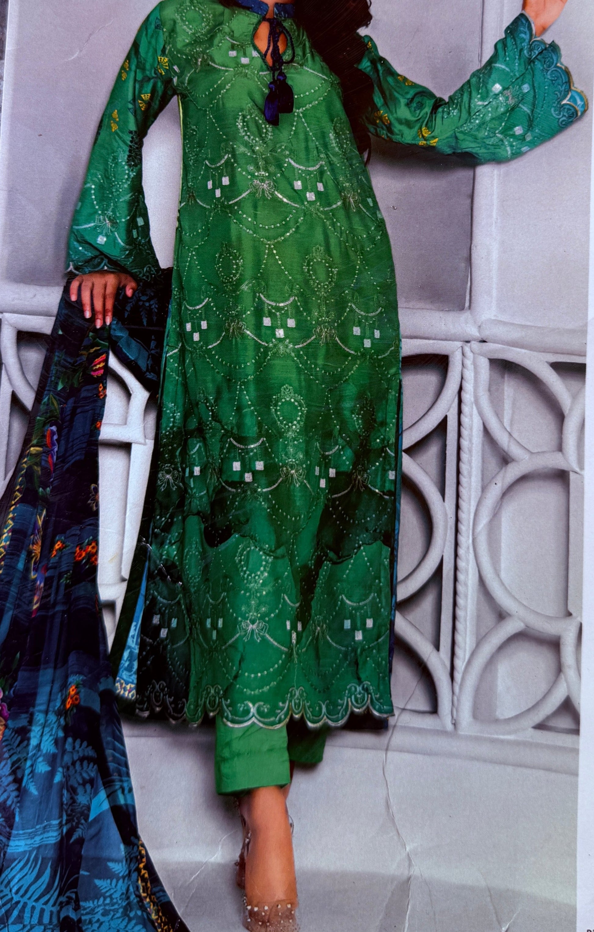 Design: Exquisite Schiffli embroidered front enhanced with delicate sequin work, paired with a printed back and sleeves for a refined, graceful appeal.