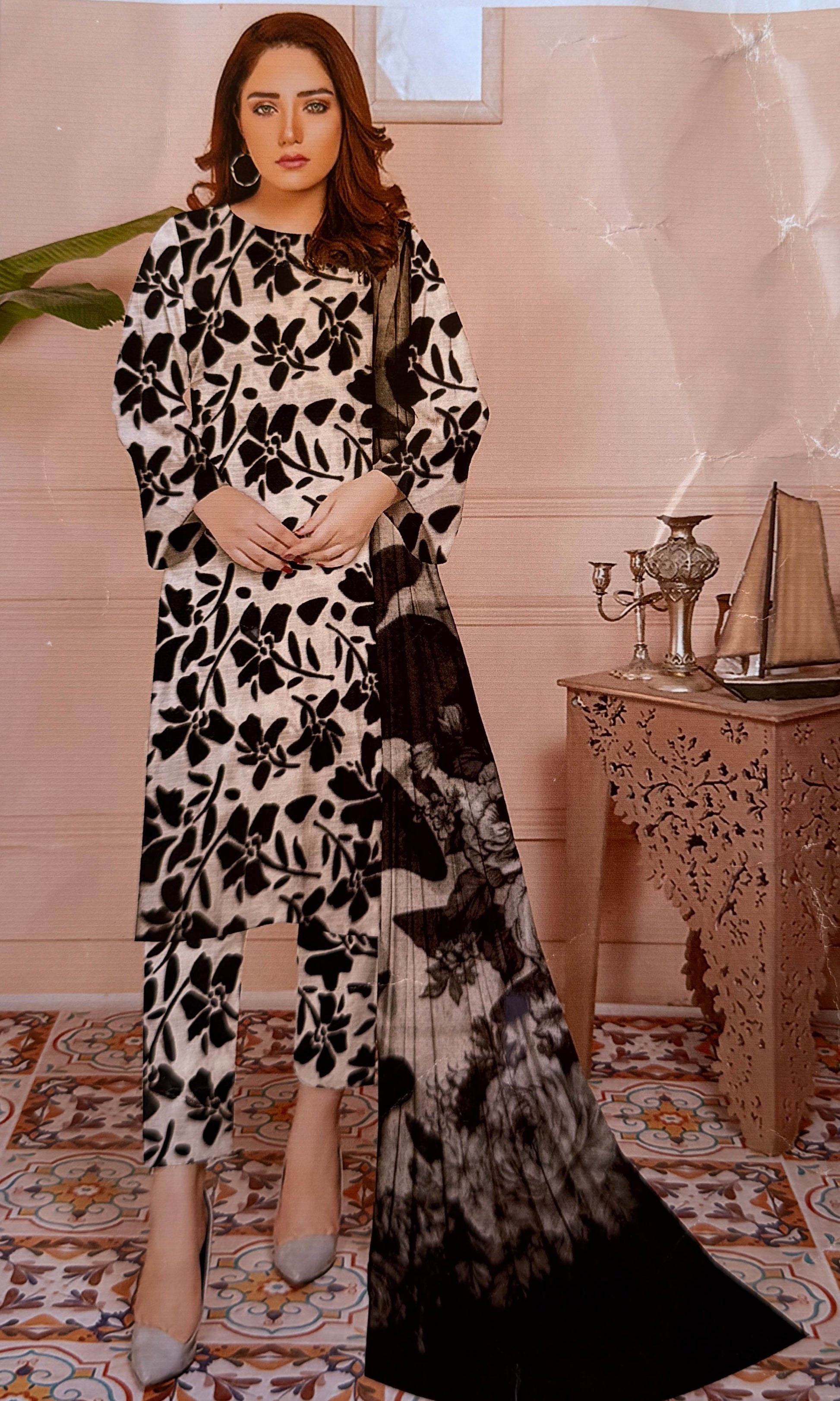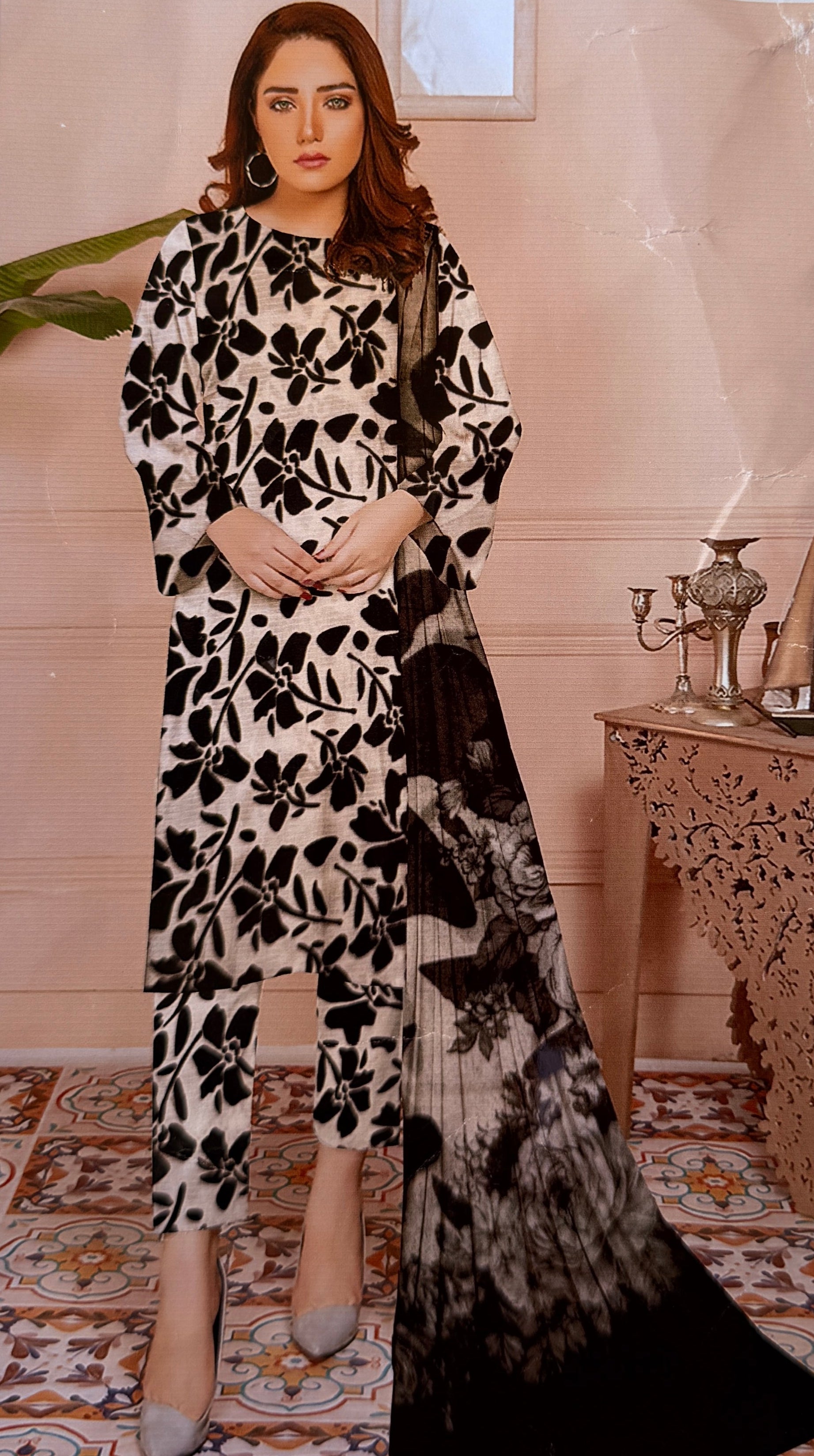 Design: A stunning digital printed bamber chiffon dupatta featuring intricate designs and a lightweight flow, adding a refined finish to the ensemble.