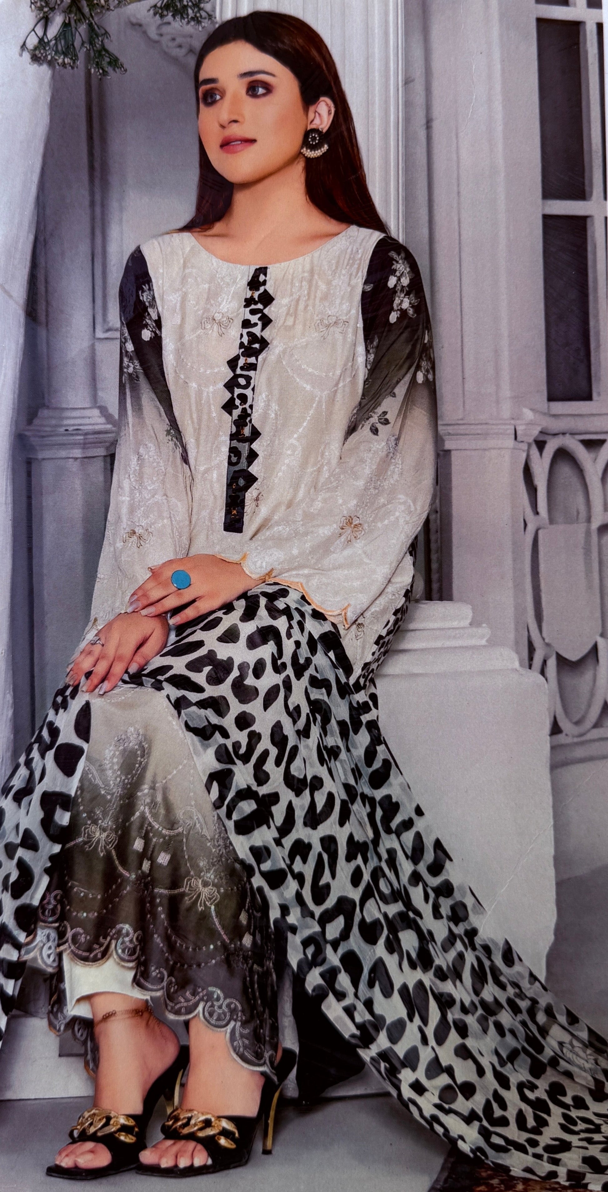 Design: Exquisite Schiffli embroidered front enhanced with delicate sequin work, paired with a printed back and sleeves for a refined, graceful appeal.