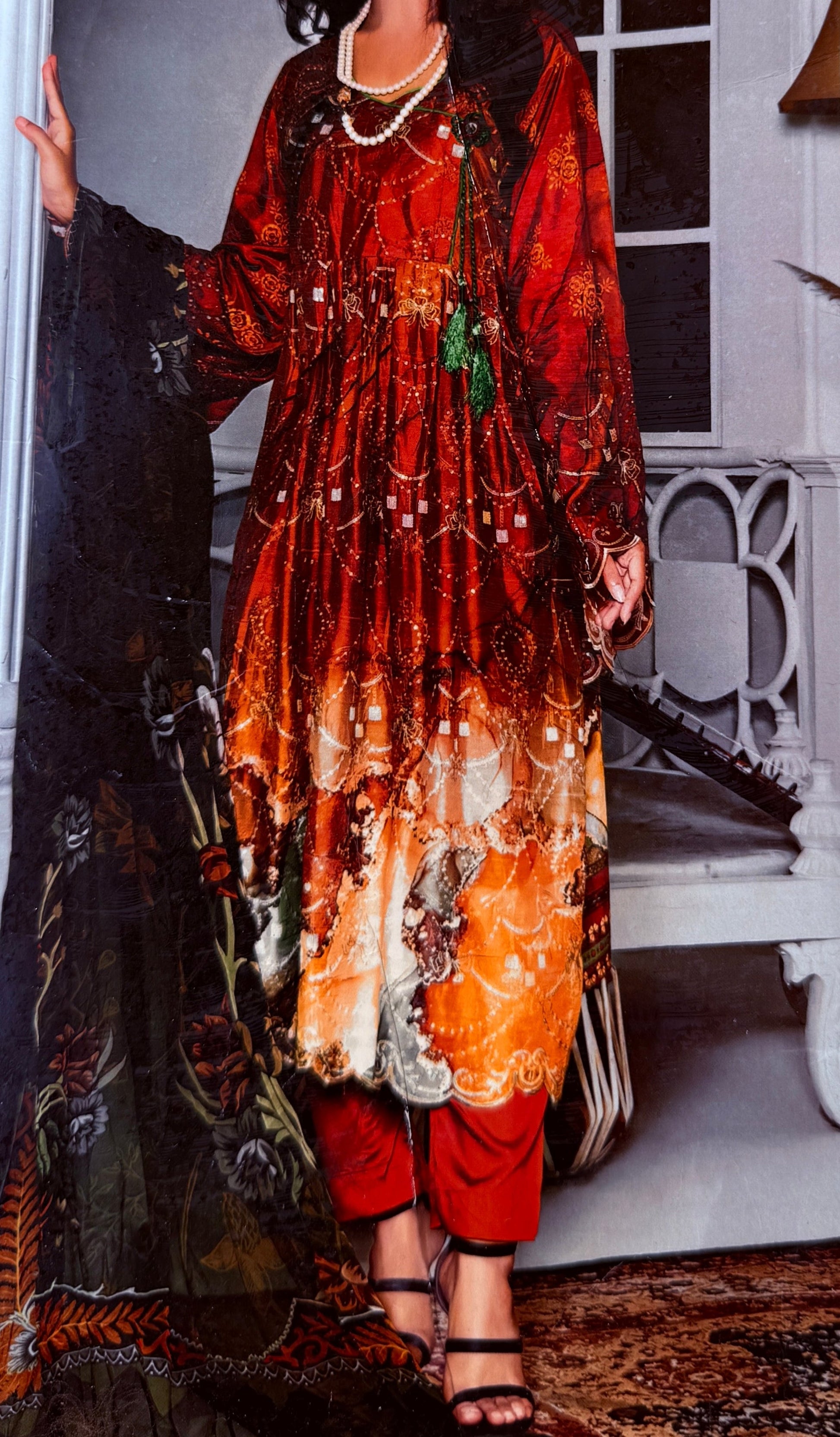 Design: Exquisite Schiffli embroidered front enhanced with delicate sequin work, paired with a printed back and sleeves for a refined, graceful appeal.