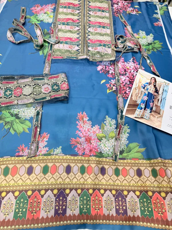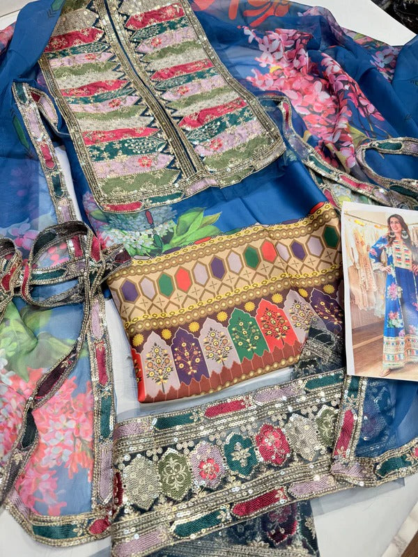 The outfit is completed with a ready-to-wear digital printed silk dupatta, enhancing the overall attire with soft elegance and artistic patterns that reflect refined taste.
