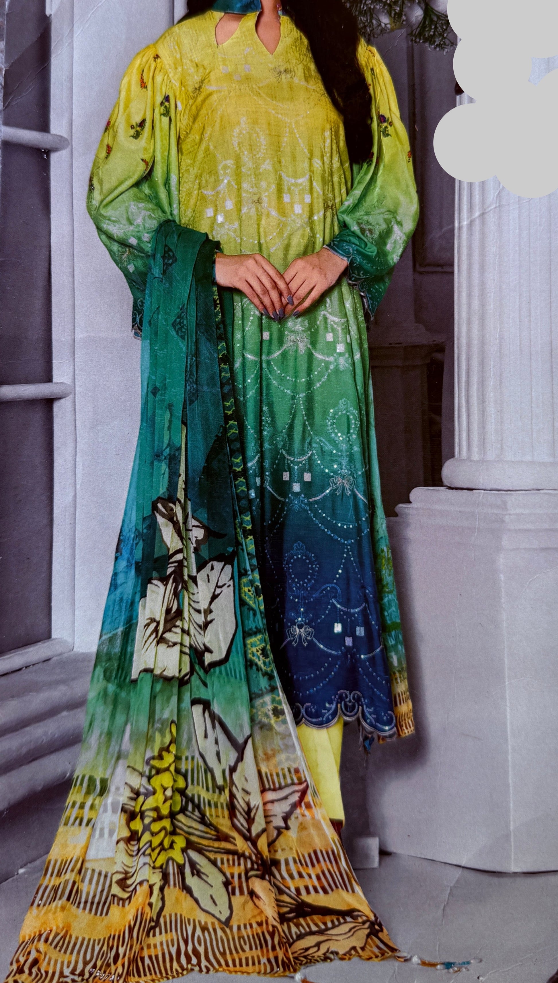 Design: Exquisite Schiffli embroidered front enhanced with delicate sequin work, paired with a printed back and sleeves for a refined, graceful appeal.